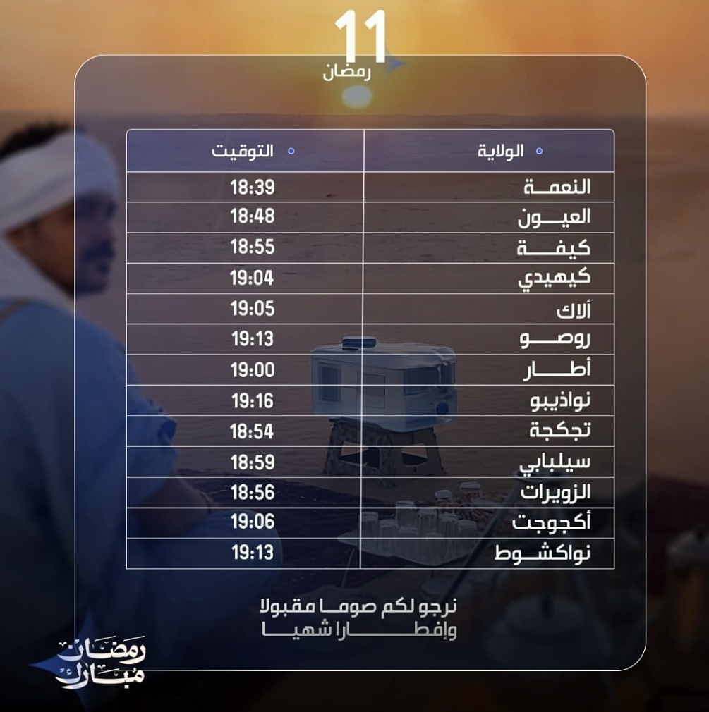 وهذه أوقات الإفطار في عواصم ولايات موريتانيا بالنسبة لليوم الحادي عشر من شهر رمضان 1447 ه.